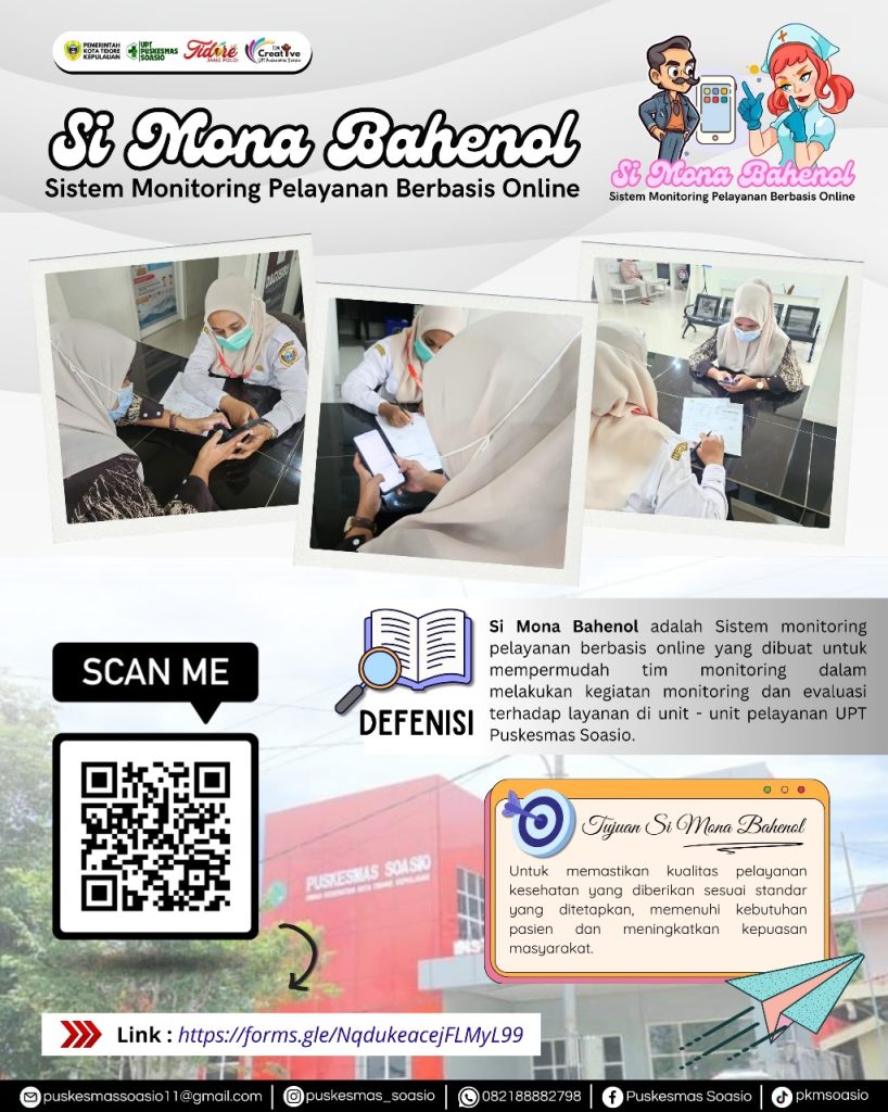 Untuk meningkatkan mutu pelayanaan Kesehatan pada indikator kepatuhan identifikasi pasien dan kepuasan pengguna layanan perlunya penerapan metode baru dengan memanfaatkan tekhnologi untuk meningkatkan efektifitas dan pemantauan kualitas pelayanan yang diberikan. Puskesmas soasio Kota Tidore Kepulauan mengembangkan inovasi Si Mona Bahenol atau sistem monitoring pelayanan berbasis online sebagai salah satu upaya untuk memberikan kemudahan kepada masyarakat dalam hal melakukan penilaian terhadap pelayanan puskesmas soasio dan memudahkan petugas dalam mengevaluasi kinerja pelayanan. Upaya ini dilakukan puskesmas soasio untuk menidentifikasi kebutuhan dan harapan masyarakat dalam menerima pelayanan Kesehatan, karena setiap orang berhak mendapatkan pelaynan yang aman dan bermutu seseuai dengan standar pelayanan. Untuk mewujudkan pelayanan Kesehatan yang aman dan bermutu setiap tempat pelayanan termasuk fasilitas pelayanan Kesehatan Tingkat pertama (FKTP) Puskesmas Soasio wajib memenuhi indikator Nasional Mutu pelayanan (INM) yang dilaksanakan. Untuk itu Puskesmas Soasio kota tidore kepulauan mengagas upaya ini dengan sebuah Inovasi “ SI MONA BAHENOL “ sistem monitoring pelayanan berbasis online. Harapannya inovasi “SI MONA BAHENOL” ini dapat mengali kekurangan-kekurangan pelayanan yang ada di puskesmas soasio, sehinga dapat di perbaiki dan di tingkatkan untuk memunuhi kebutuhan dan harapan masyarakat tentang pelayanan yang diberikan, sehinga masyarakat merasa aman dan bermutu untuk menerima layanan yang diberikan. Dalam penggunaan Iovasi “ SI MONA BAHENOAL “ dapat di lakukan dengan cara sebagai berikut : Masyarakat atau pengguna layanan di puskesmas soasio dapat ,mengakses dengan mengunakan tautan link https://forms.gle/NqdukeacejFLMyL99 untuk memberikan penilaian ataupun bisa memindai barcode yang terdapat pada gambar. Masyarakat bisa langsung mengisi identitas dan sejumlah pertanyaan tentang pelayanan yang didapatkan pengguna layanan atau masyarakat terhadap pelayanan di UPT. Puskesmas Soasio. Masyarakat juga dapat memberikan aduan dan saran yang dapat di isi di kolom aduan maupun masukan. Setiap masukan yang diberikan baik berupa saran maupun kritik yang bersifat membangun akan segera kami tindak lanjut untuk meningkatkan kualitas pelayanan kami. MOTO kami : “URE SE JAGA LAHA SUNG SIGADO NGO” Kesehatan adalah modal yang harus dipelihara.